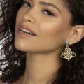 Sterling Silver is plated with gold metal and formed into this intricate design for these Earrings. At the post of these Earrings are cabochon Aqua Chalcedony stones. The Earrings are made by brothers, Ahmet and Murat, in Istanbul, Turkey.