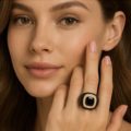 This Ring was made in a workshop in Italy. It is made in Sterling Silver with black enamel and a man-made black colored stone. The center black stone is surrounded by small white man-made stones. Tell us your Ring size and we will permanently adjust this Ring to your Ring size.