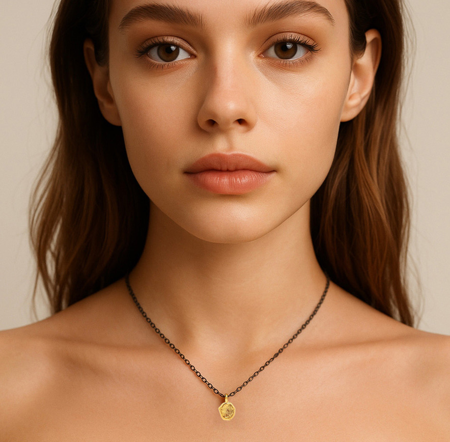 The link chain on this Necklace is 16 inches long. The chain is made in oxidized Sterling Silver, which is a black Sterling Silver. From the chain hangs a pendant that is gold-plated and in an uneven oval shape. The Necklace is made in Holland.
