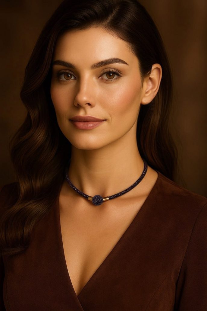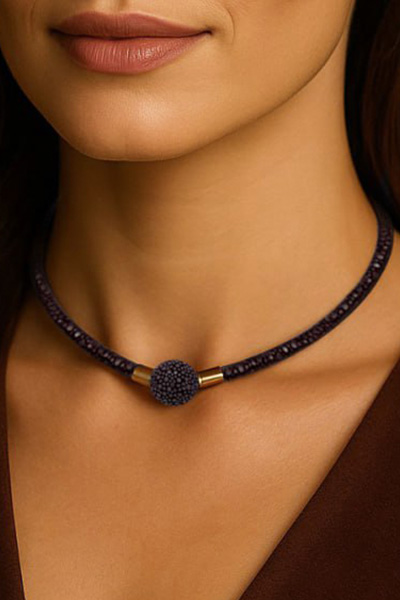 Feel smart in this purple Stingray Leather Necklace. The Necklace connects at the center ball. It is interchangeable with other center pieces. The Necklace is 17 1/2 inches long. It is created by the German designer, Rohde Schmuckwaren.