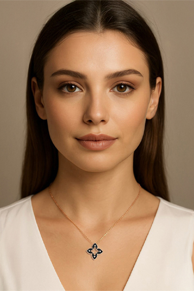 This Necklace has a pendant that is in the shape of a four leaf clover- which is called a “quatrefoil”. The quatrefoil has a Sterling Silver frame with a rose gold overlay. The pendant is inset with black and white Zircon stones. The pendant hangs from a Sterling Silver chain, with this rose gold overlay. The chain is adjustable from 16 to 18 inches.