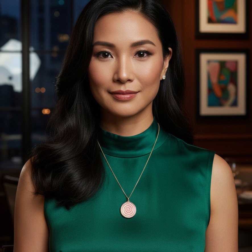 This Necklace is made with a Pendant of a swirling design of conch shell. The Pendant is one inch in diameter. It hangs from an adjustable Chain. The Chain can extend as long as 22 inches and as short as you may need it. it is a gold-filled box Chain. The Necklace is completed in its creation in the United States.
